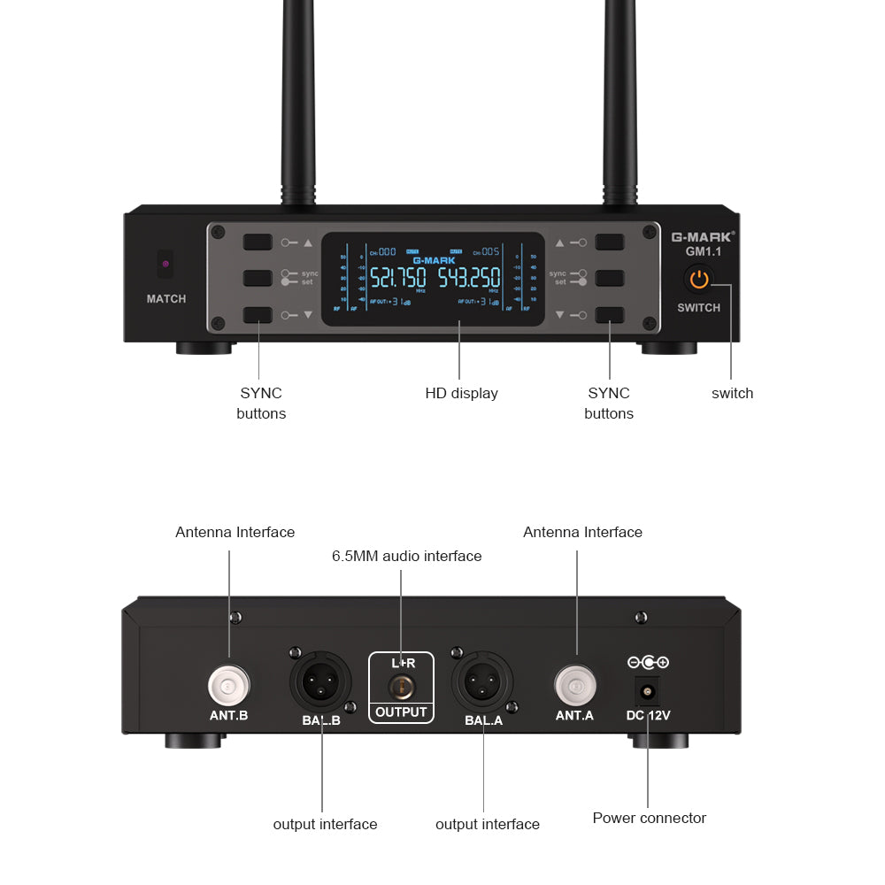 Strong anti-interference ability in the UHF band: In busy wireless environments, such as large-scale event sites, multiple wireless devices may work at the same time, causing mutual interference. GM1.1 can effectively reduce interference and ensure the clarity and stability of audio transmission through ultra-high frequency UHF wireless technology and design.