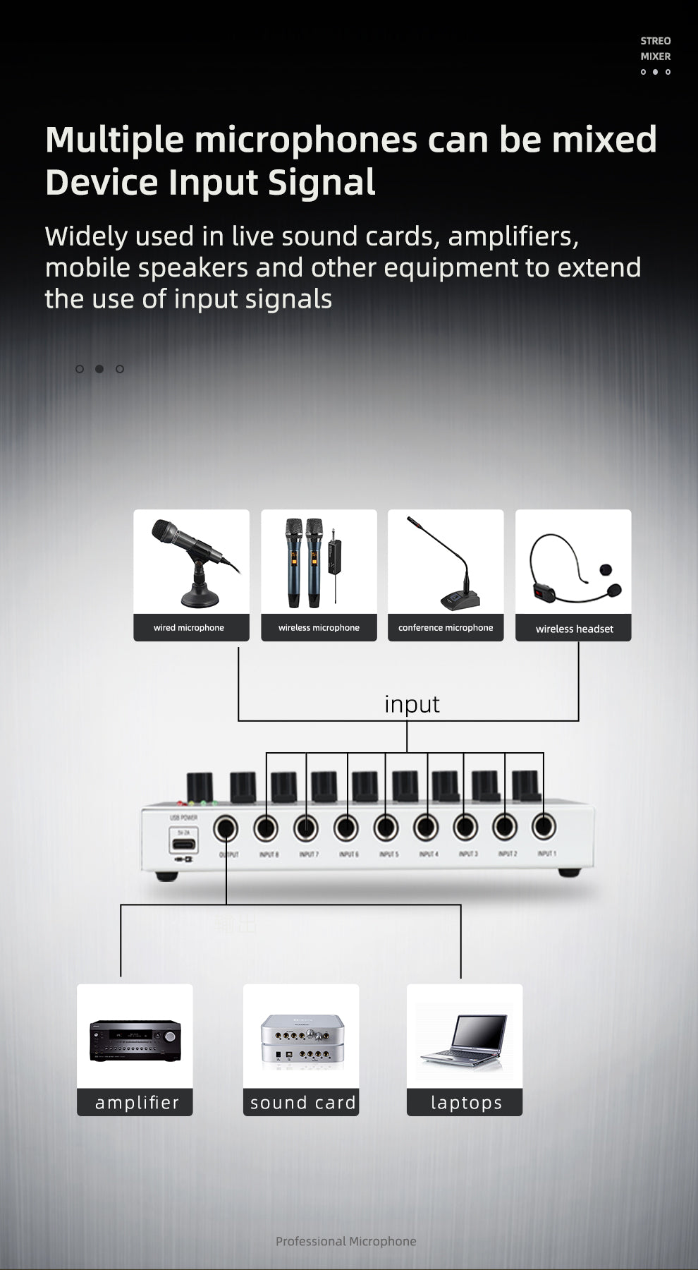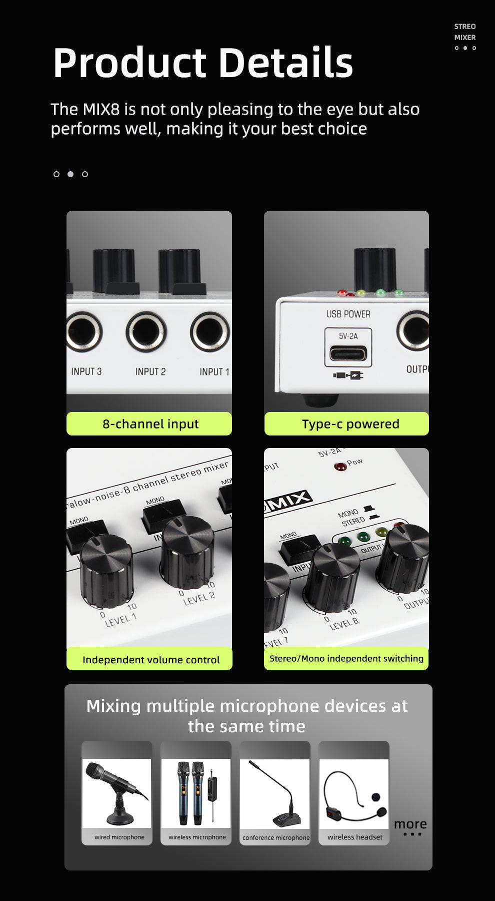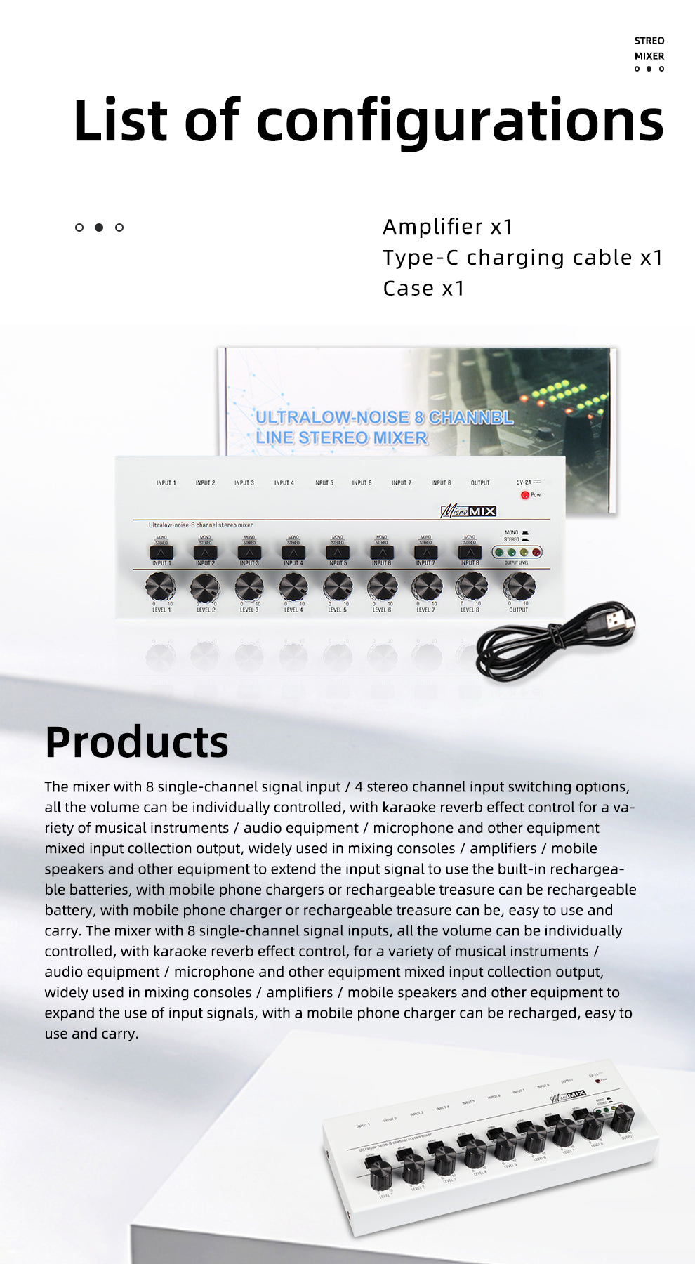 The MIX 8 is the most versatile mixer we've made to date. It can support multiple 6.5mm mono or 3.5mm stereo channels, making it fully suitable for musical instruments, turntables, mobile devices, speakers and much more.