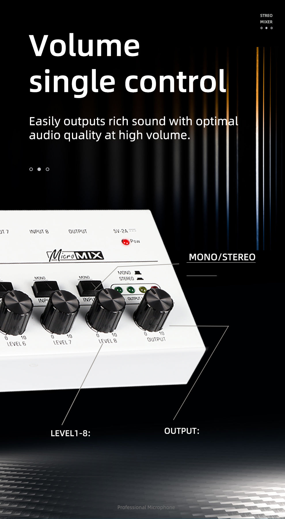 Mono and stereo switching can be adjusted to suit different musical instruments or microphone needs. The volume can be adjusted individually for each channel.