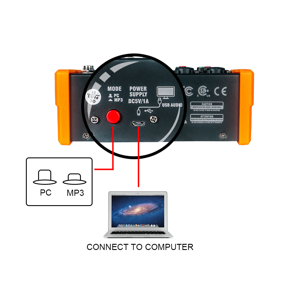 The mixer is equipped with input gain and high bass adjustment, built-in 48v phantom power supply for direct condenser microphone power supply, high definition headphone output port, mp3, wma, wav, flac transmission, device with a sound card can be connected directly to the pc.