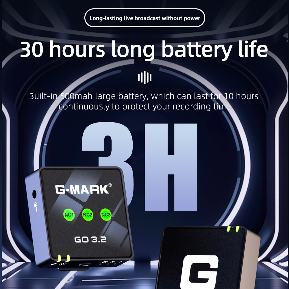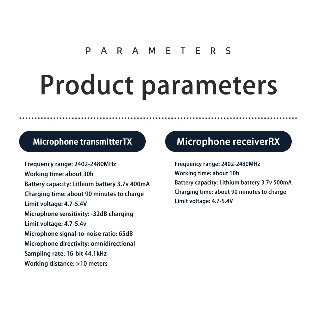 The receiver contains a built-in 500mAh rechargeable lithium battery, which can work up to 10 hours after fully charged, and supports charging while recording; the charging cable also allows you to charge the transmitter and receiver at the same time.